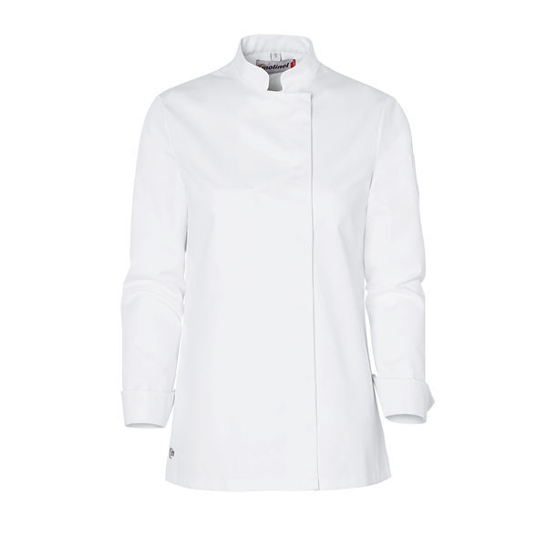 Veste femme à col officier. Fermeture asymétrique par 6 boutons-pression cachés. Poche stylo sur manche gauche. Manches longues. Poche intérieure.