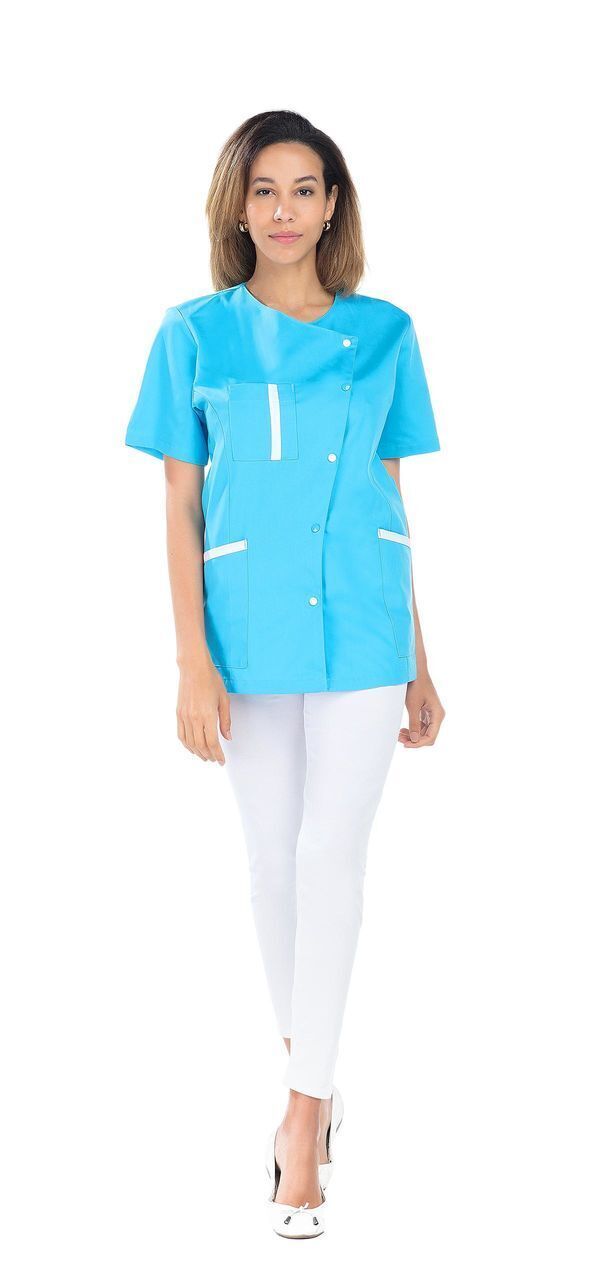 Tunique femme. Encolure V. Fermeture asymétrique par boutons-pression contrastées. Poche poitrine avec compartiment stylo, 2 poches basses. Manches courtes. Longueur : 75 cm.