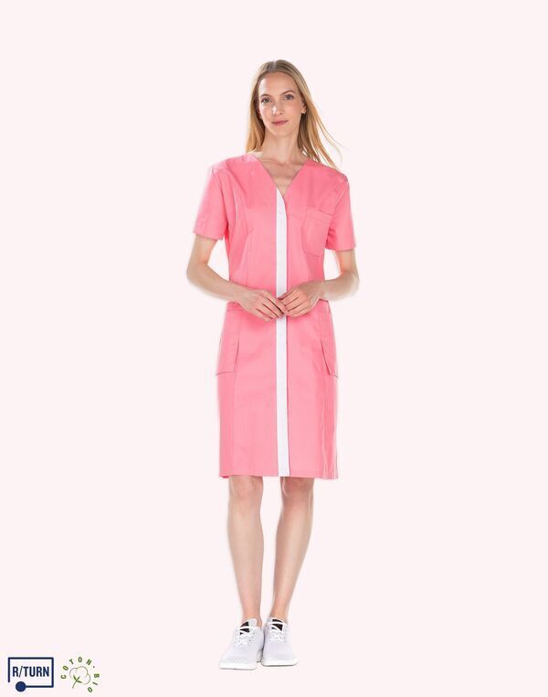 Tunique encolure V. Fermeture milieu devant par boutons-pression, parement contrasté. Découpe de cintrage. Poche poitrine, poche BIP. 2 poches basses semi-volantes. 2 fentes dos. Longueur : 75 cm.