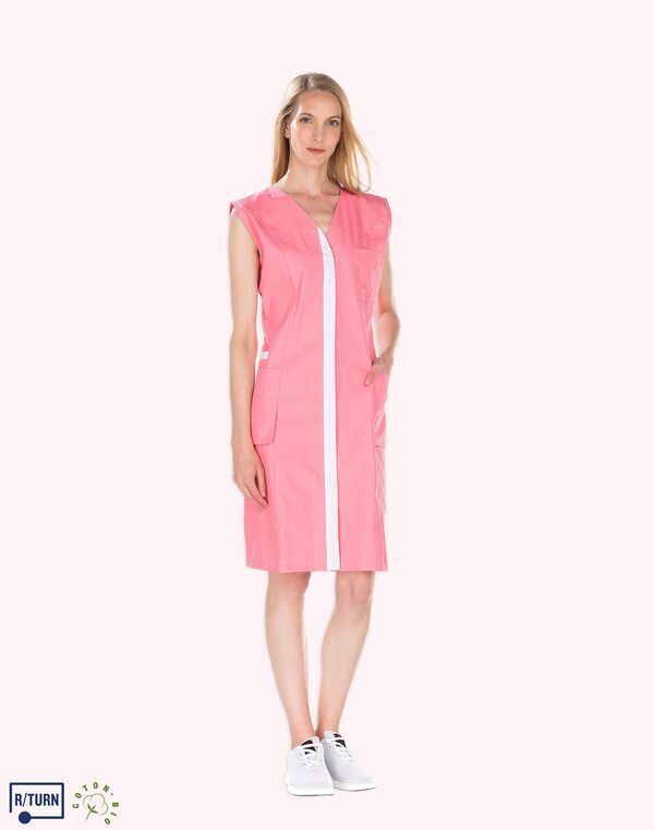 Tunique encolure V. Fermeture milieu devant par boutons-pression, parement contrasté. Découpe de cintrage. Poche poitrine, poche BIP. 2 poches basses semi-volantes. 2 fentes dos. Longueur : 75 cm.