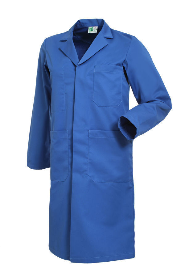 Blouse homme. Col tailleur. Fermeture milieu devant par boutons-pression sous patte. Poche poitrine. 2 poches basses. Manches longues. Longueur : 100 cm.