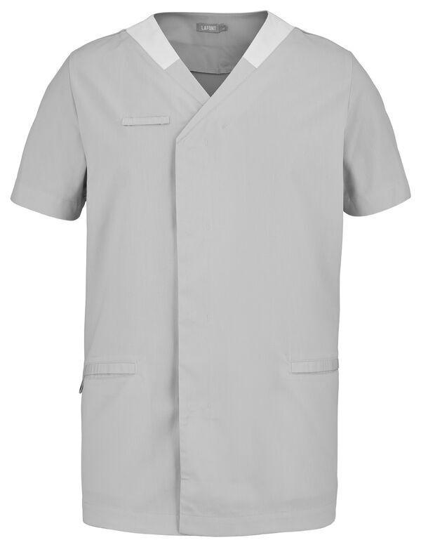 Blouse . Encolure V contrastée, collerette de marquage intérieur. Fermeture croisée par grippers cachés. 2 poches basses passepoilées. Passant porte-badge. Manches courtes. Longueur : 75 cm.