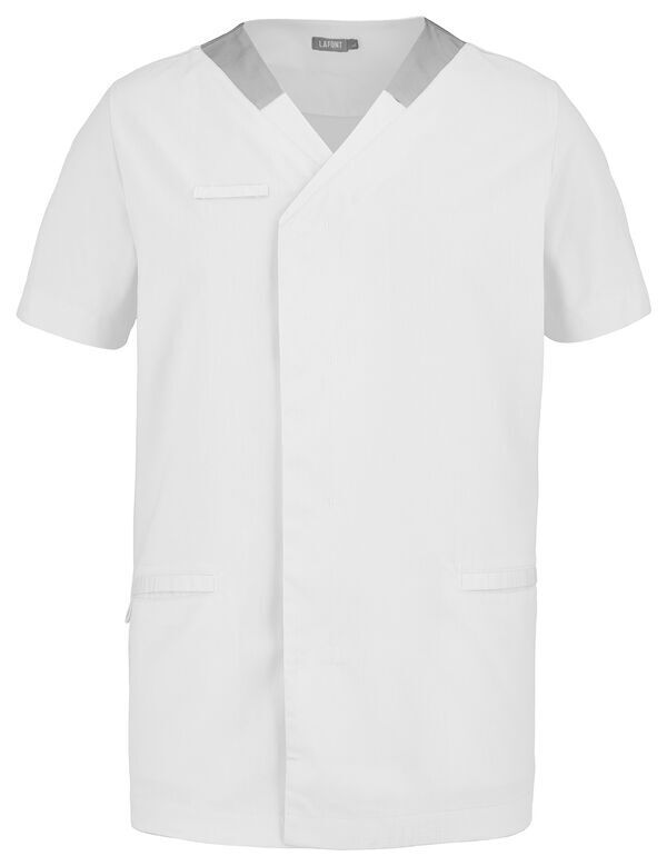 Blouse . Encolure V contrastée, collerette de marquage intérieur. Fermeture croisée par grippers cachés. 2 poches basses passepoilées. Passant porte-badge. Manches courtes. Longueur : 75 cm.