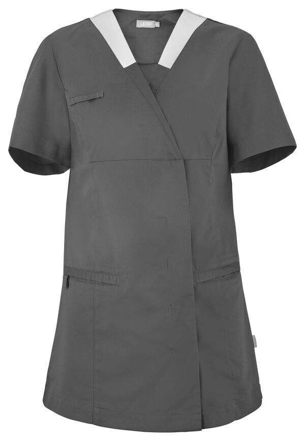 Tunique . Encolure V contrastée, collerette de marquage intérieur. Fermeture croisée par grippers cachés. Découpes princesses. Poche poitrine passepoilée. 2 poches basses passepoilées. Passant porte-badge. Manches courtes. Longueur : 75 cm.